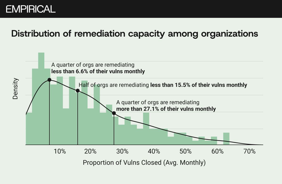 Prioritization to Prediction Vol. 8 formalizes that in a simulation: start with each organization’s open vulnerabilities, impose a capacity constraint, apply different prioritization strategies. The capacity levels are grounded in observed enterprise behavior: a low capacity organization closes 6.6% of open vulns per month, a median closes 15.2%, and a high capacity organization closes 27.1%. The median is about 15%.