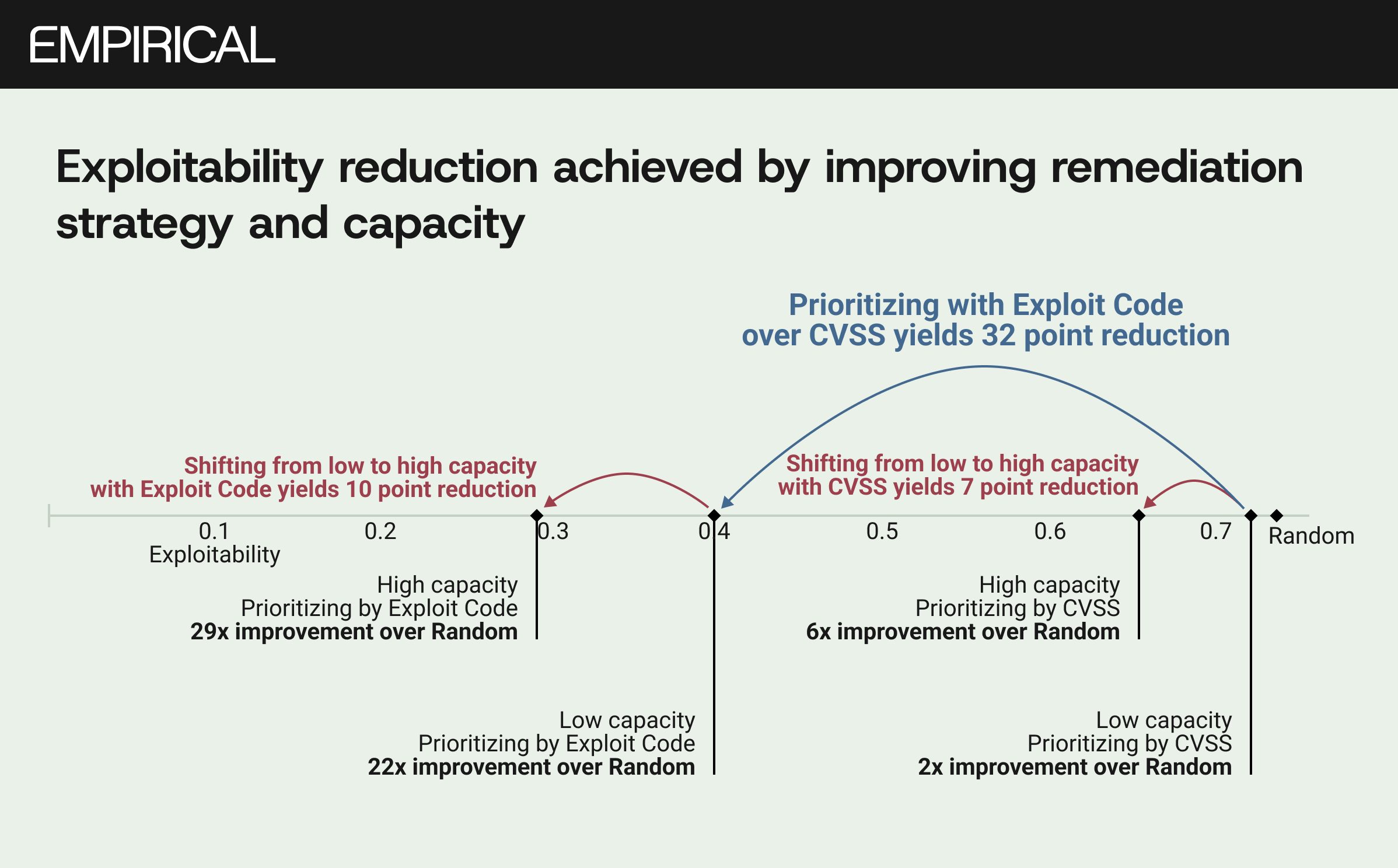 With low capacity and CVSS-based prioritization, an organization achieves roughly a 2× improvement over random. Quadrupling that capacity while keeping the same poor strategy gets you to around 6×—meaningful, but expensive. Switching to exploit-code-driven prioritization at low capacity jumps the outcome to approximately 22×. Combine high capacity with exploit-code strategy and the figure reaches roughly 29×.
