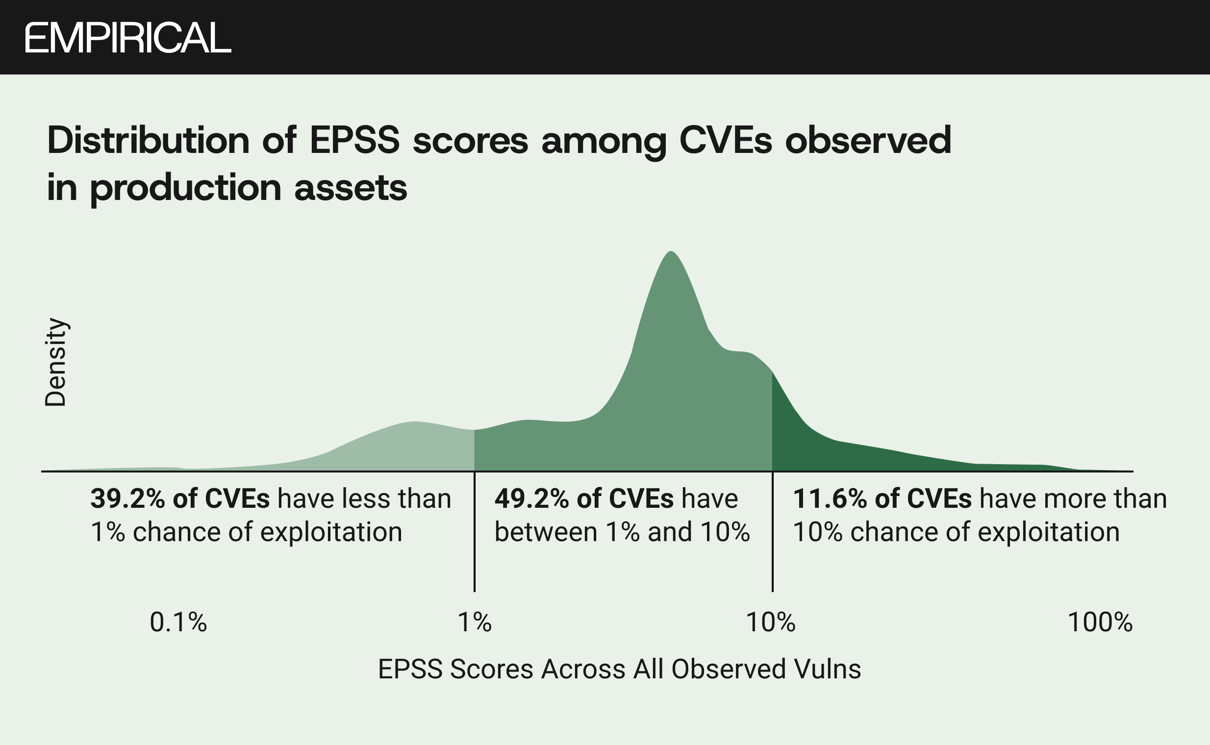 Figure 2 is the one I keep coming back to. It shows the distribution of EPSS scores across CVEs actually observed in production. Compared to the full CVE list, the distribution shifts right, hard. Among all published CVEs, 63% carry less than a 1% probability of exploitation. Among those observed in live enterprise environments, that share drops to 39%. Nearly half (49%) sit in the 1-to-10% band, and almost 12% exceed a 10% chance.