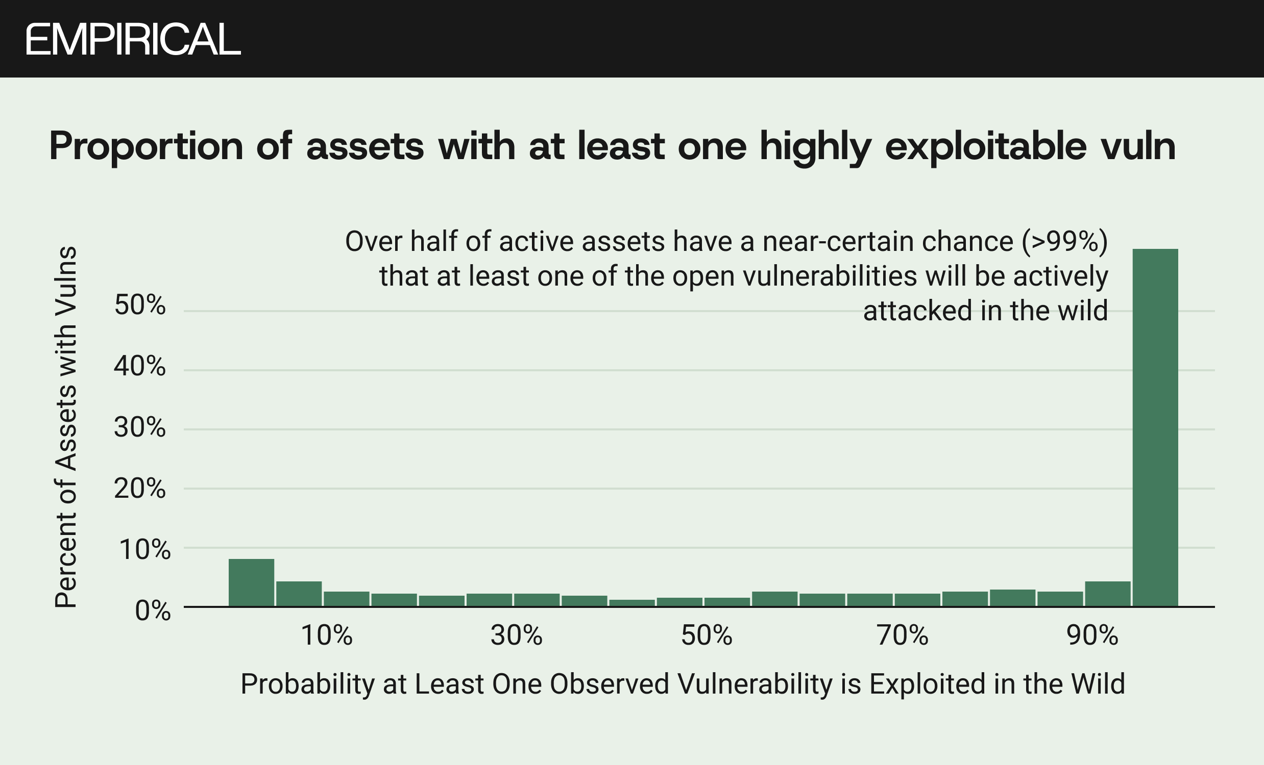 Figure 3 drives the conclusion home at the asset level. More than half of all active assets in the study, 1.8 million of 3.5 million, had a greater than 99% probability that at least one of their open vulnerabilities was being actively exploited somewhere in the wild. Ninety-five percent of assets had at least one vulnerability with a greater than 10% EPSS score, which puts it in the top 5% of all disclosed CVEs.