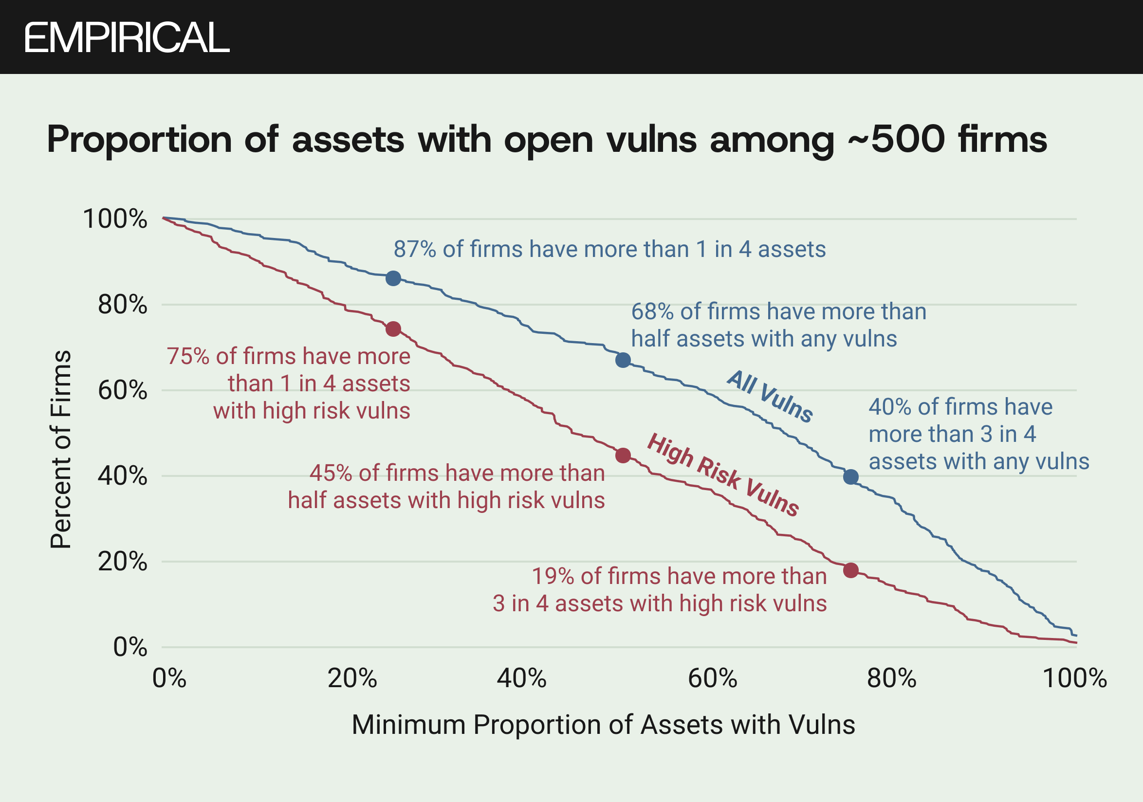 Figure 1 plots the proportion of active assets with open vulnerabilities across the ~500 firms. Eighty-seven percent of organizations showed vulnerabilities on more than a quarter of their assets. Sixty-eight percent showed them on more than half. Follow the high-risk line (those CVEs with known exploit code or active exploitation in the wild) and 75% of firms still had at least one in four assets sitting in the blast radius. Nineteen percent had three in four.